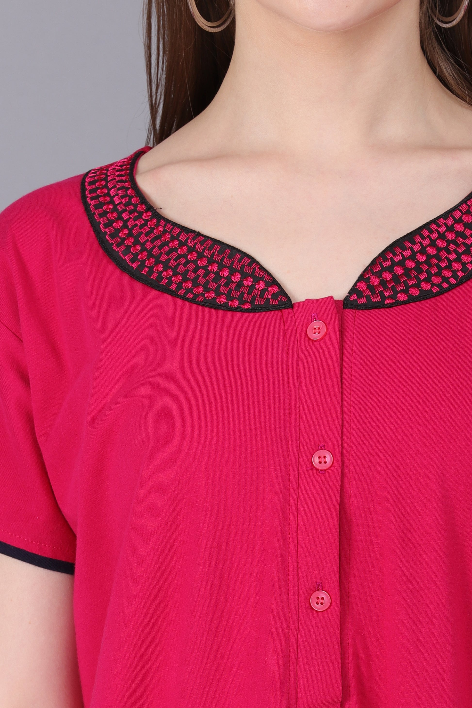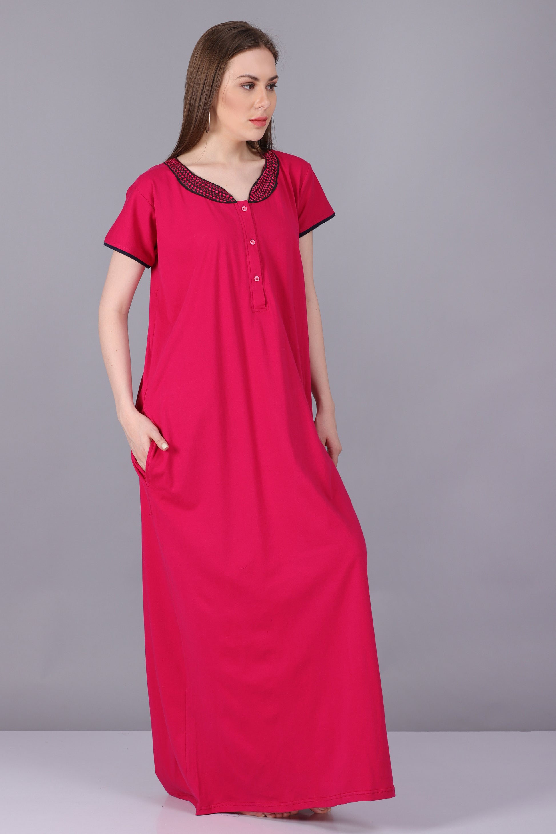Women Hosiery Solid Pink Night Gown | Maxi | Nighty | Embroidery Neck | With Pocket