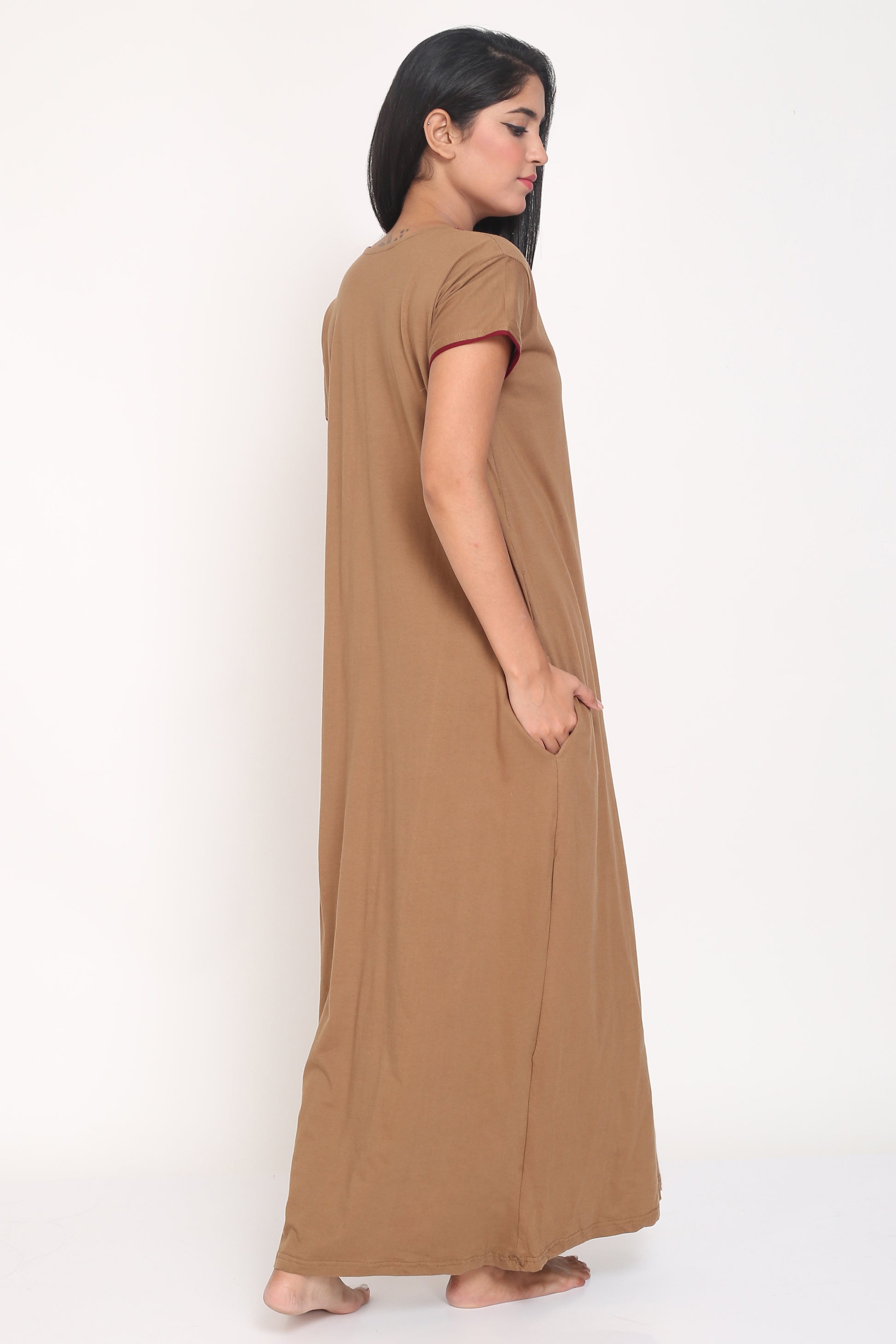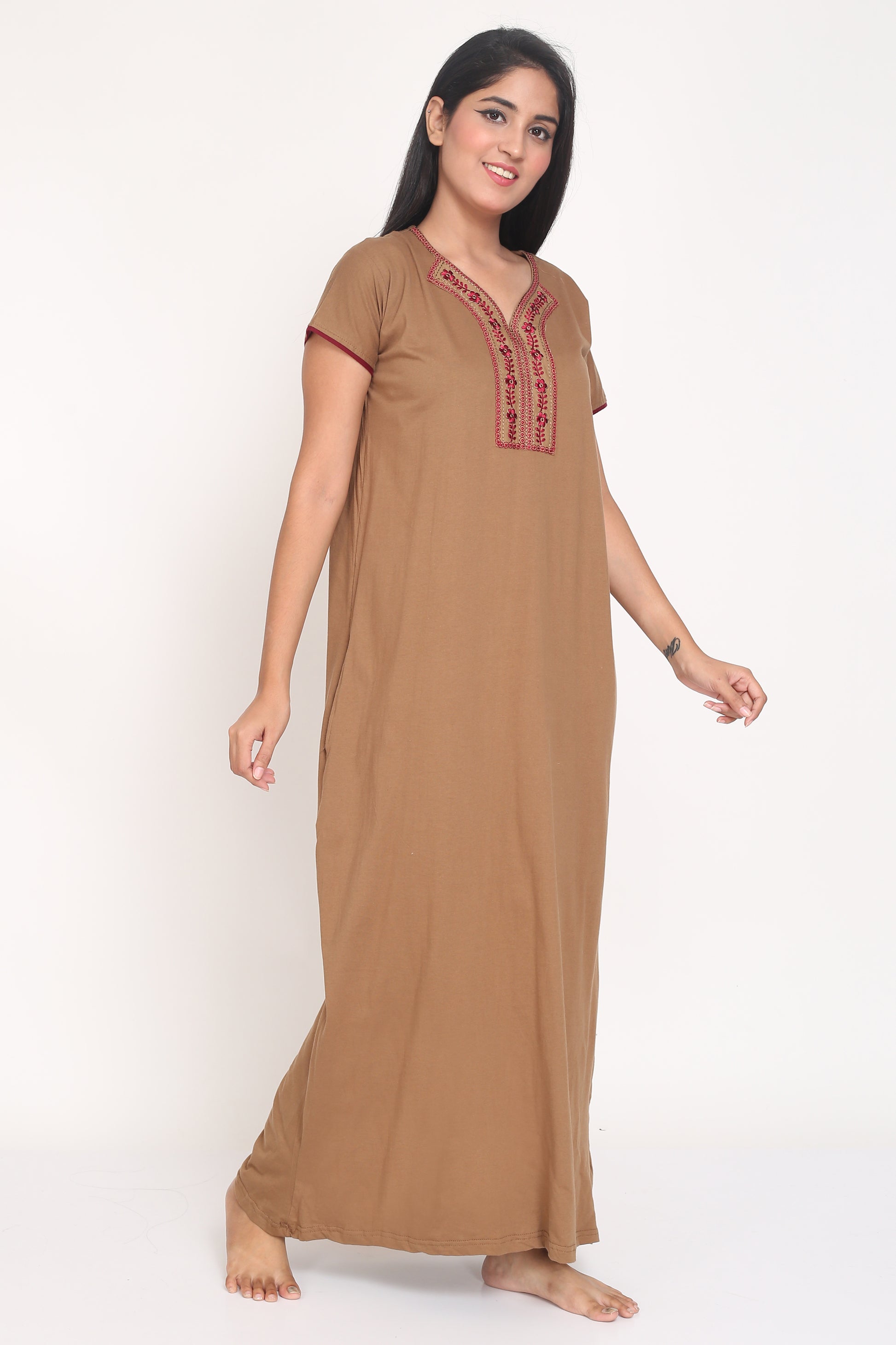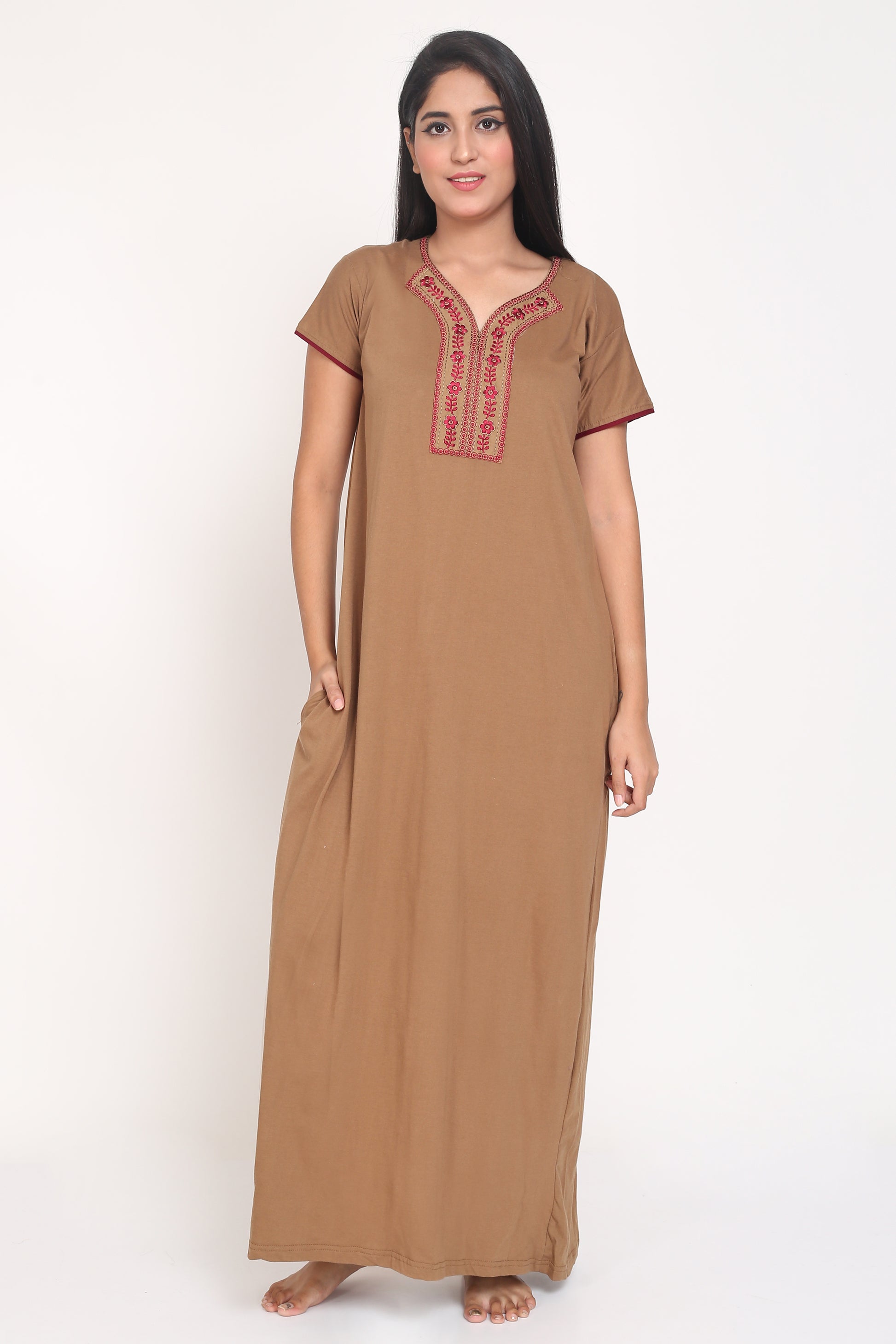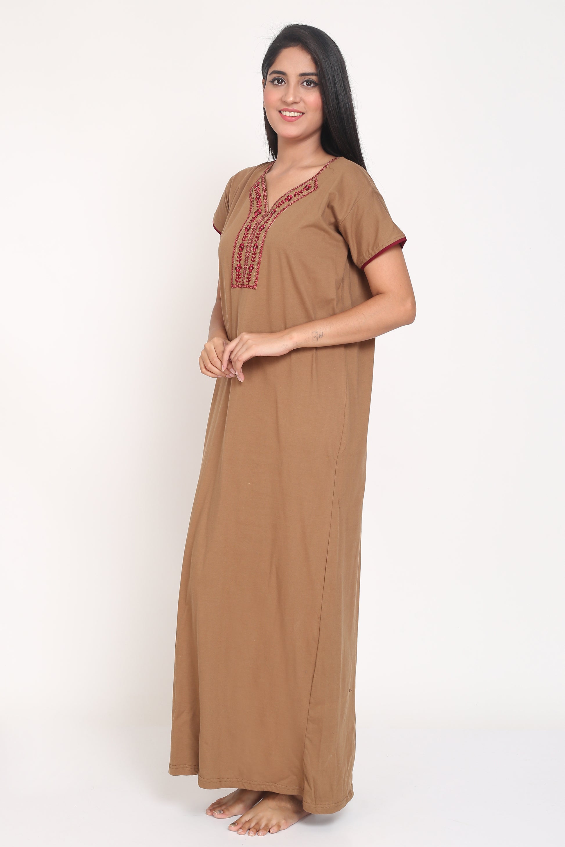 Women's Hosiery Brown Plain Maxi Nightgown with Embroidery Neck
